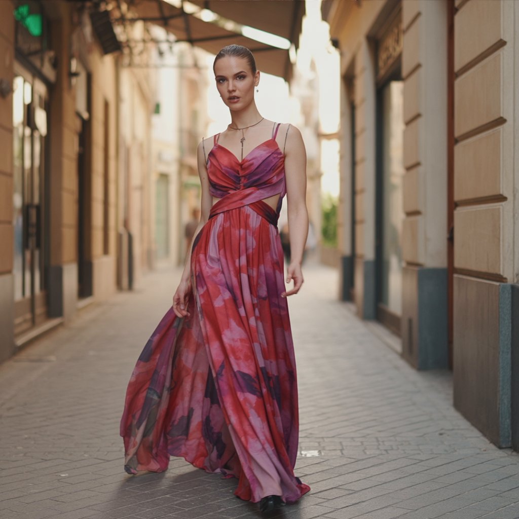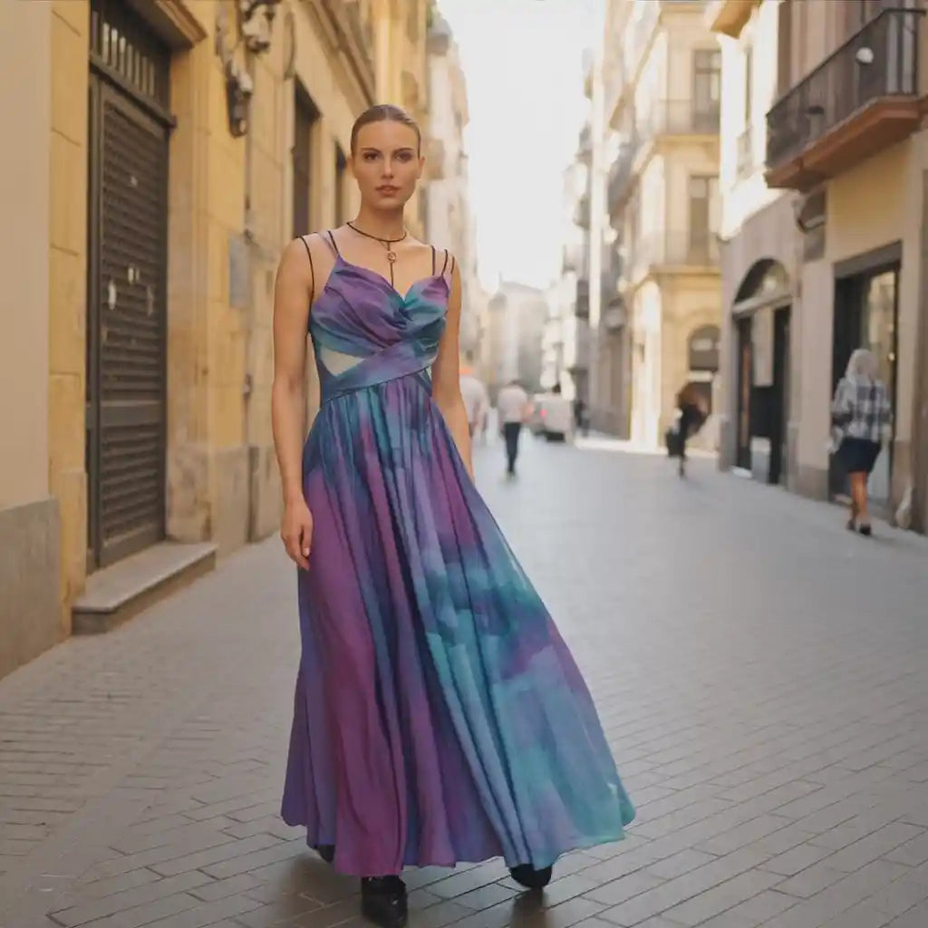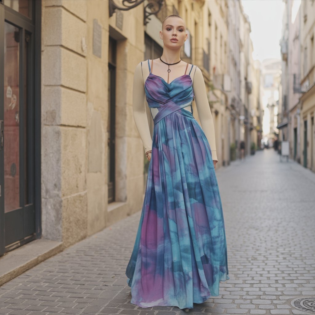 Tauche ein in pure Raffinesse mit dem Aelwena – Träger-Ombre-Maxikleid , das zarte Eleganz mit modernem Stil verbindet. Mit seinem schmalen Wickelausschnitt, fließenden Lagen und feinen Trägern zaubert dieses Kleid eine feminine Silhouette mit traumhafter Leichtigkeit – ideal für Gartenfeste, Sommerabende oder stilvolle Urlaube.